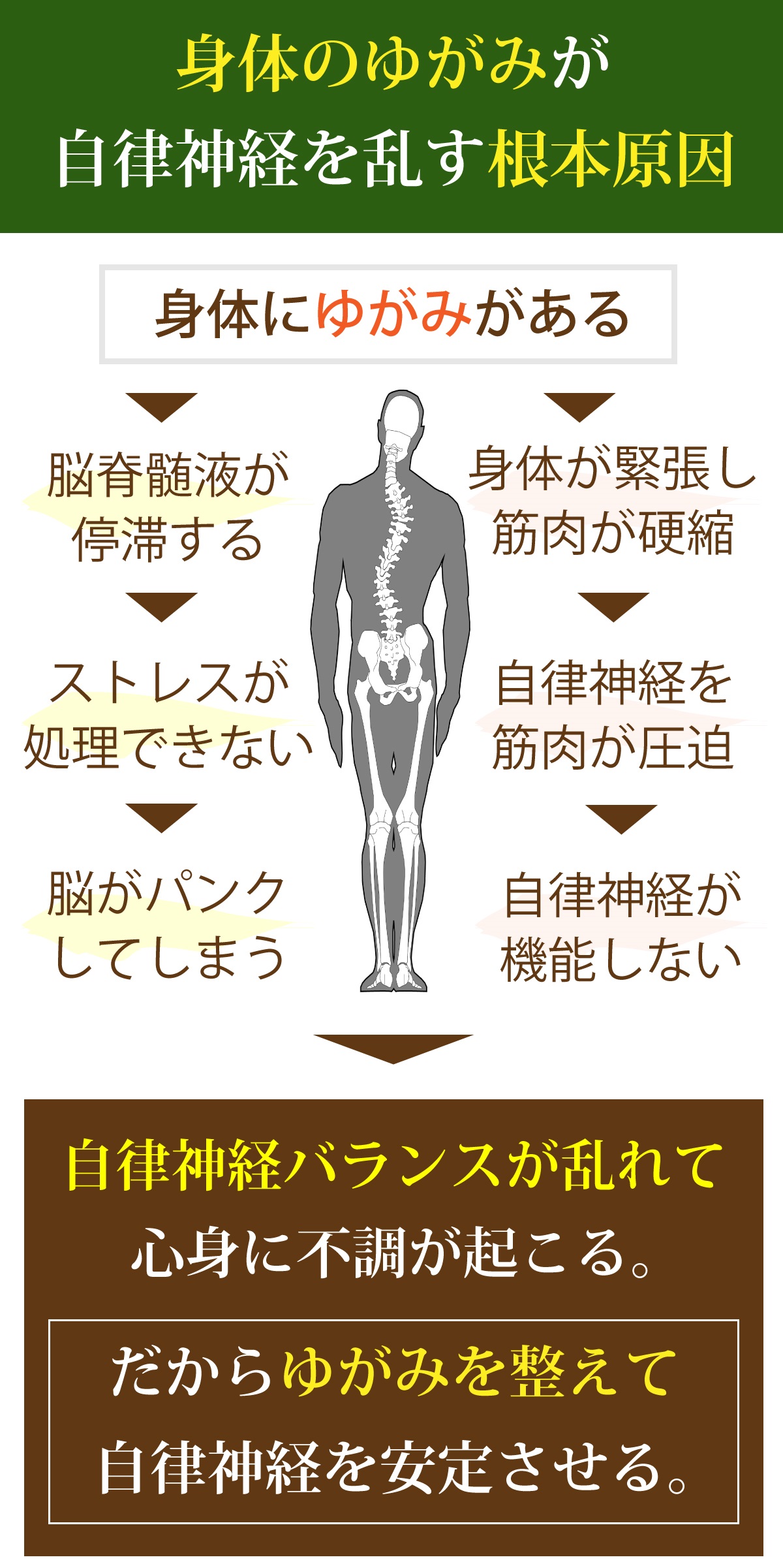 自律神経が乱れて原因不明の症状がでてしまうのは、実は「身体のゆがみ」があるせいです。