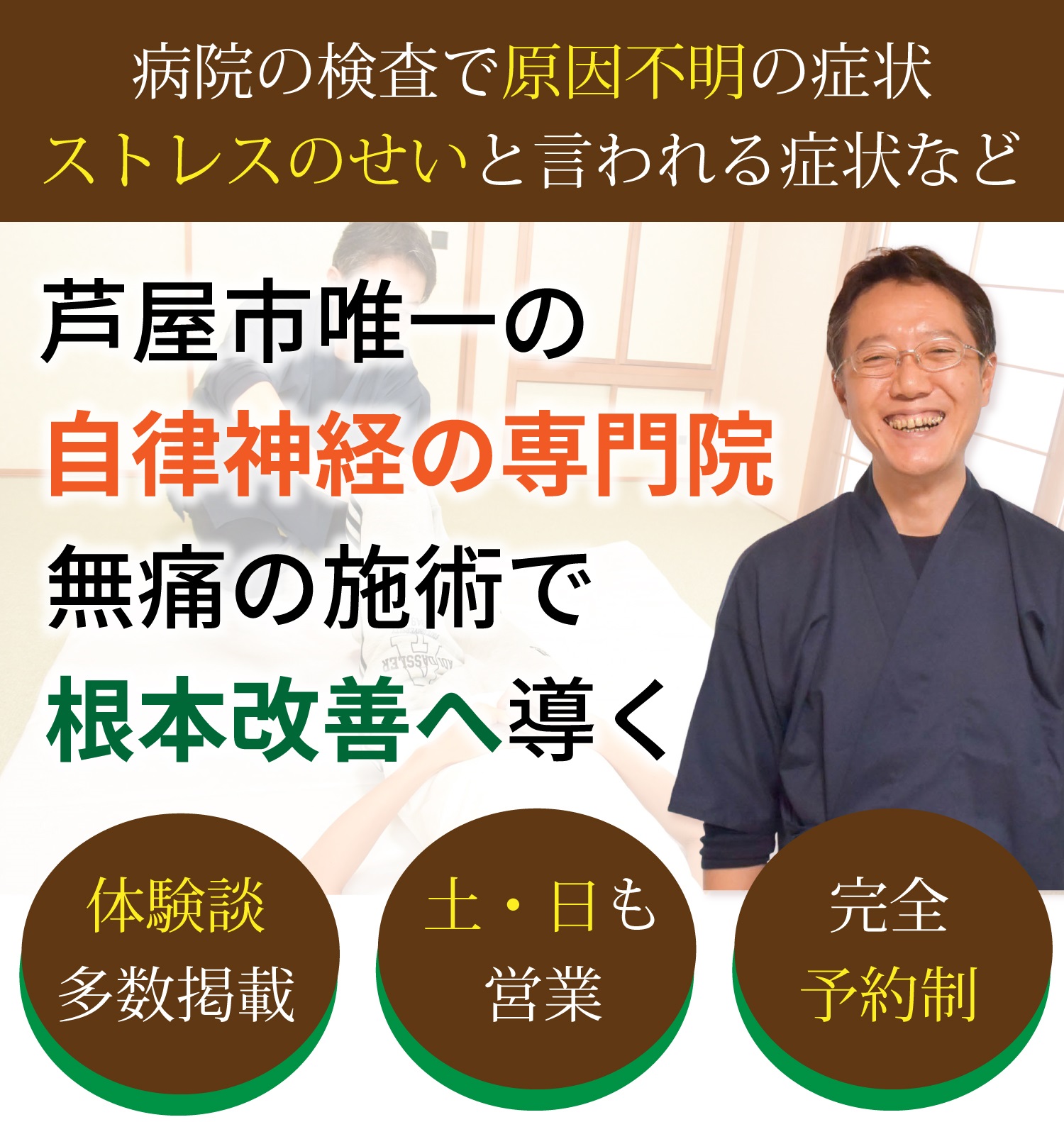 しんそう芦屋浜は自律神経専門院です。乱れた自律神経を整えることを得意としています。