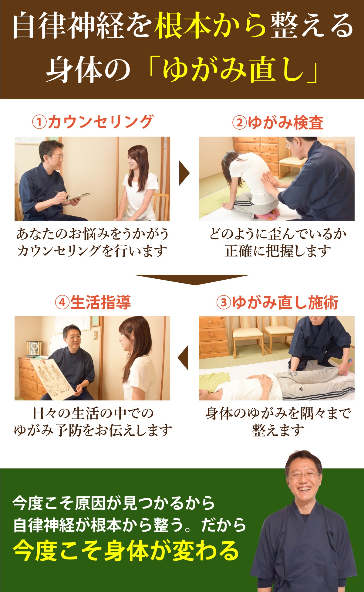 体の歪みが自律神経の働きを妨げているという考え方に基づき、骨格を本来あるべき位置に戻すことで、自律神経のバランスを回復させることを目指します。