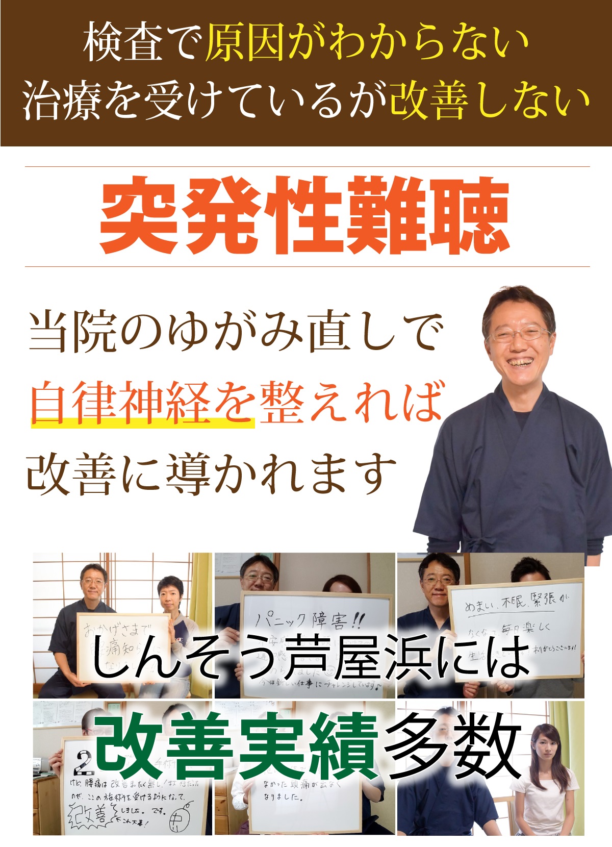 しんそう芦屋浜では、「体のゆがみ直し」という施術で自律神経を整えて、突発性難聴を改善へ導きます。